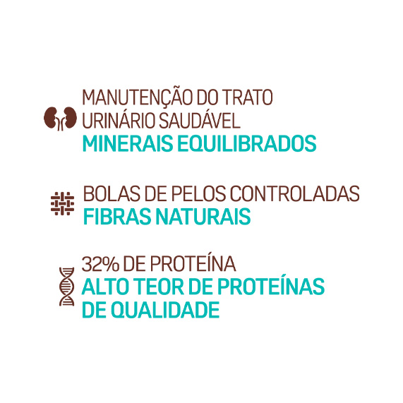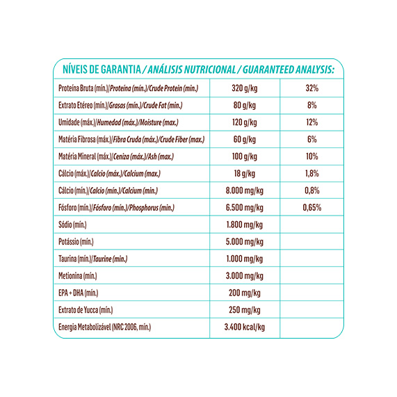 Harina de vísceras de aves, grano de maíz¹, sémola de arroz, salvado de gluten de maíz-601, salvado de trigo, salvado de soja², aceite de aves, aceite de pescado, pulpa deshidratada de remolacha, zanahoria deshidratada, fibra de caña de azúcar, hidrolizado de hígado de aves y cerdos, extracto de yucca, taurina, DL-metionina, cloruro de sodio (sal común), cloruro de potasio, ácido fosfórico, antioxidantes (BHA, BHT), propionato de amonio, ácido propiónico, vitaminas (A, D3, E, K3, B1, B2, B6, B12, pantotenato de calcio, ácido fólico, ácido nicotínico, biotina, cloruro de colina), minerales (sulfato de zinc, sulfato de hierro, sulfato de manganeso, iodato de calcio, selenito de sodio, sulfato de cobre). Posibles sustitutos: harina de vísceras con huesos, harina de vísceras de aves low ash, harina de carne y huesos de bovino, harina de carne y hueso de cerdo, hidrolizado de hígado de aves, cáscara de soja², cáscara de avena molida, grano de sorgo, frijol bandinha³, grano de trigo, grano de cebada, grano de avena, salvado de arroz desengrasado, salvado de arroz, salvado de gluten de maíz 211, DDG - residuo seco de destilería (maíz)¹, celulosa en polvo, cloruro de amonio, sulfato de amonio, propionato de calcio, sorbato de potasio, ácido cítrico, grasa de cerdo, sebo bovino, aceite de microalgas (Schizochytrium sp.), proteinato de cobre, biocolina.